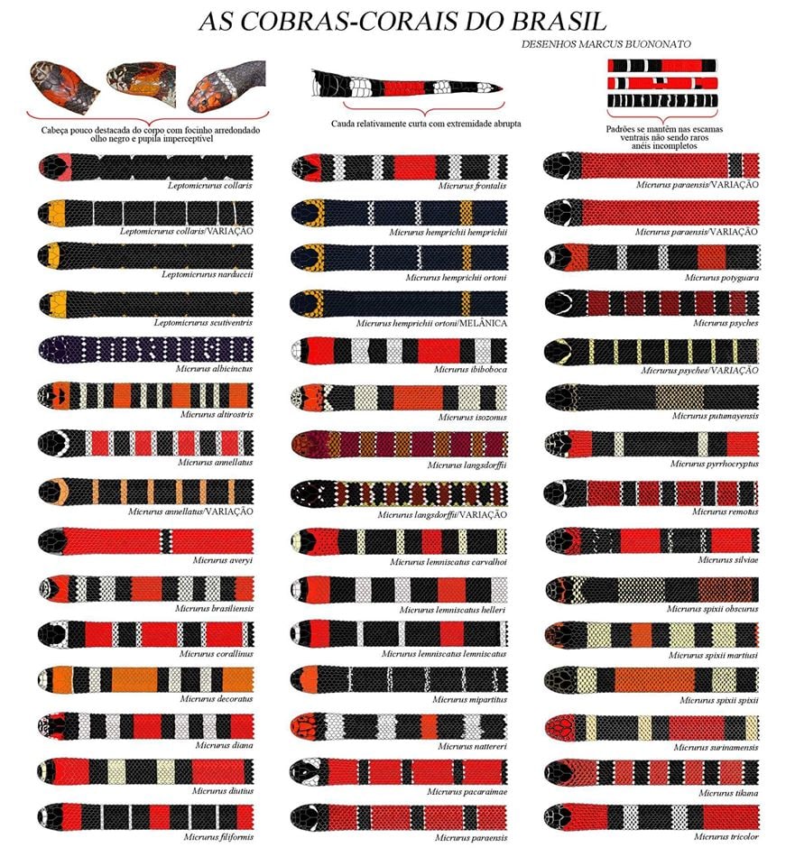 Observe a diversidade de coloração das cobras-corais pelo trabalho do ilustrador científico Marcos Buononato!